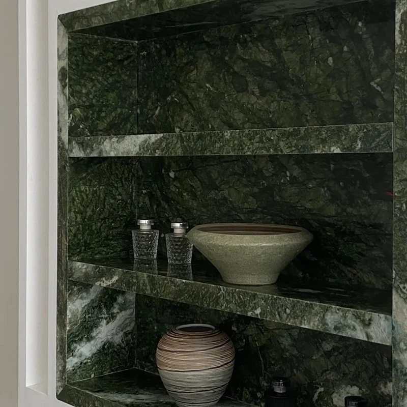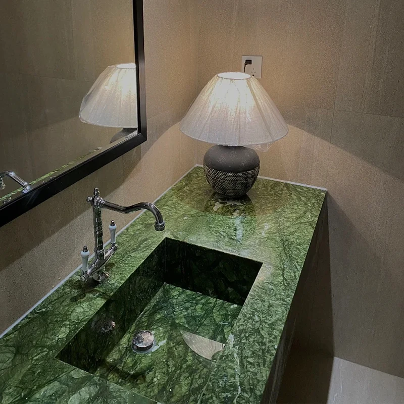Gạch đá cẩm thạch màu xanh lá cây thường được sử dụng cho các bức tường và sàn nhà, nơi màu xanh lá cây bình tĩnh của chúng mang lại sự bình tĩnh và hiếu khách. Với đá cẩm thạch này, một tính năng mới và tuyệt đẹp được thêm vào ,, cho đến sảnh của một khách sạn sang trọng, phòng khách của một ngôi nhà sành điệu hoặc phòng tắm của một spa.