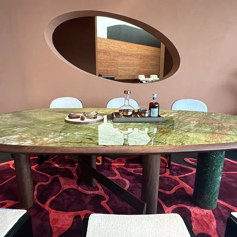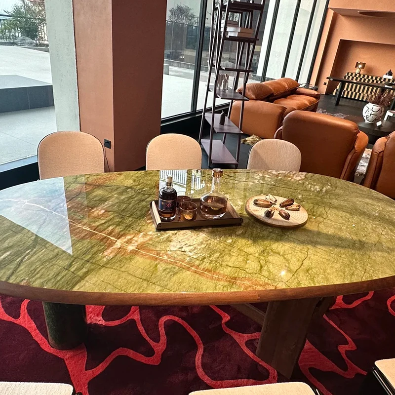 Các yếu tố thiết kế tùy chỉnh: Mặt bàn, bàn, ghế dài, tác phẩm điêu khắc hoặc các tác phẩm đặc biệt khác có thể cung cấp cho bất kỳ bầu không khí nhà nào một tài sản không phổ biến và độc quyền của Ming Green Marble.