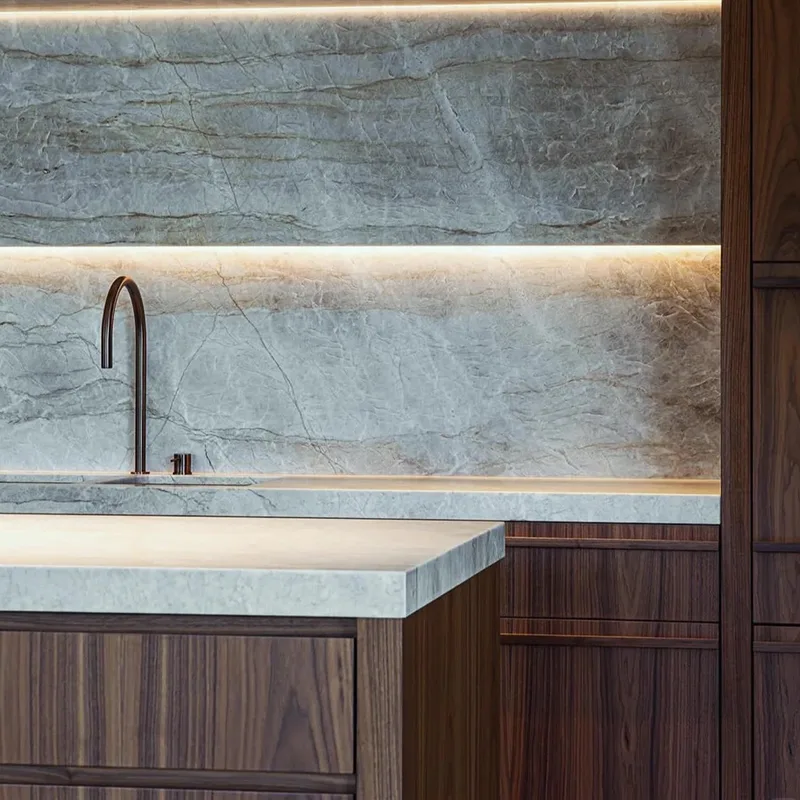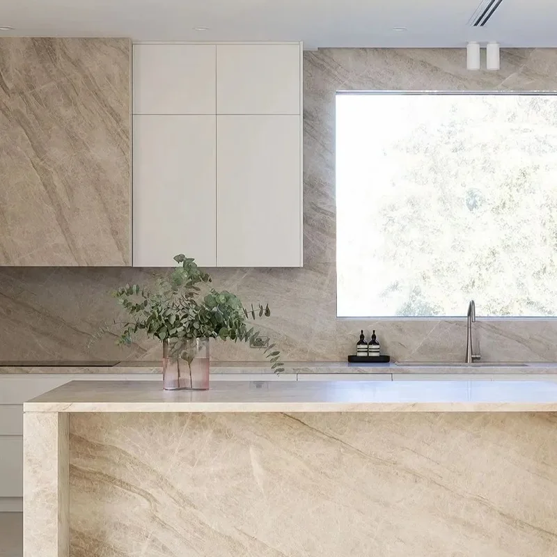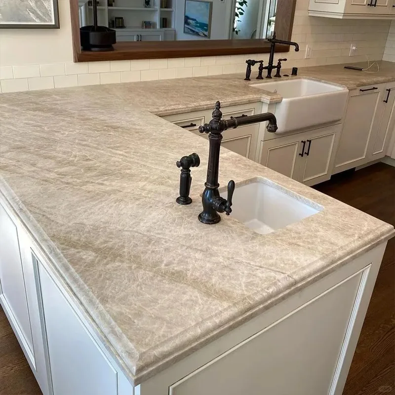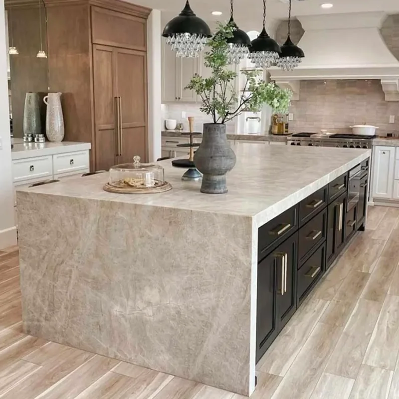 Taj Mahal Quartzite mặt bàn là một lựa chọn tốt cho trang trí nhà bếp hiện đại. Đá này là phổ biến cho mờ và có thể là đèn nền.