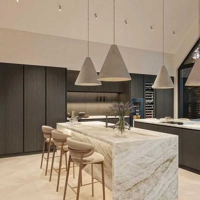 Châu Âu: Favours thiết kế tối giản với 2 tấm cm, thường xuyên sử dụng các viên gạch backsplash của Taj Mahal Quartzite để phù hợp với bộ đếm chính.